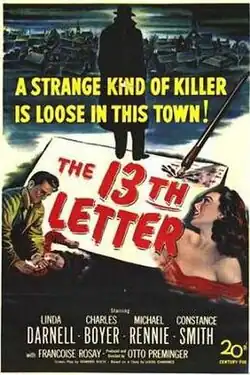 The 13th Letter is a 1951 American film noir mystery film directed by Otto Preminger and starring Linda Darnell, Charles Boyer, Michael Rennie, and Constance Smith.[1][2] The film is a remake of the French film Le Corbeau (The Raven, 1943) directed by Henri-Georges Clouzot.