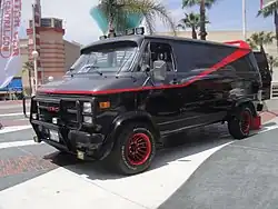 The 1983 GMC Vandura van used by the A-Team, with its characteristic red stripe, black and red turbine mag wheels, and rooftop spoiler,[39] is an enduring pop culture icon. The customized 1994 GMC van in The A-Team movie was displayed at the 2010 New York International Auto Show.[40]