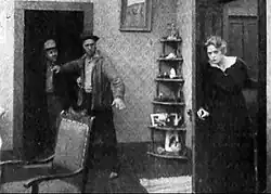The tramps flee, but are apprehended by the sheriff. Stewart, who has been living in the tramp camp, comes up to try helping his friends. When he enters the house he sees Heath lying dead on the floor and Emily also lying there, but in a dead faint. Stewart thinks Emily has shot her husband so he tells the sheriff he is responsible for Heath's death. When Emily regains consciousness, she tells the sheriff that Stewart was not the man who struggled with her husband. As Stewart is being released by the sheriff, Emily recognizes him and tells him she always loved him; no charges were filed in the death of Heath as the sheriff's opinion is that Heath got what he deserved.[8]