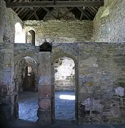 The rectangular Blue Lias stone building has a stone tiled roof. It is 12.4 metres (41 ft) long and 6.6 metres (22 ft) wide.[3] The ground floor had three rooms, one larger than the others which had a fireplace, and a door in the southern wall.[3] The larger room was the hall and linked by arched doorways to the smaller rooms.[21] There were two rooms on the first floor, which were damaged in the fire of 1884, which also has a small entrance door which was accessed via exterior stone steps which no longer exist. There was also a latrine in a turret which no longer exists.[21] There are small traceried arched windows.[2]