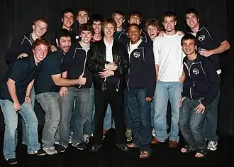 The Academical Village People (AVP) is an a cappella group at the University of Virginia founded in 1993 by a group of people who vowed to "never take themselves too seriously."[1] They set themselves apart from other groups by being able to keep professional while maintaining their lax attitude, wild antics while performing, and their less traditional uniform of a garage mechanic style shirt. The name "Academical Village People" comes from Thomas Jefferson's Academical Village at the university in Charlottesville, Virginia.[2] As of 2017, AVP, as it is often called for short, has released thirteen studio albums, including a greatest hits album, DECADEmical: Best of 1993-2003, of its first ten years in existence.[3] The group has recorded many notable performances such as opening for Dana Carvey[4] and Girl Talk, performing for Reba McEntire at the White House, concerts at the Kennedy Center, and performances in such countries as England, Spain, and Scotland.[5]
