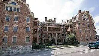 Cincinnati's traditional single-family houses were sufficient for city residents into the 1860s, but rapid postwar growth caused land prices to rise, and apartment living became more desirable even for the city's wealthier residents.[2]: 12 At first, downtown was the favored location for these developments, with many lining West Fourth and West Ninth Streets. However, the rise of Thomas J. Emery's Sons saw a rapid increase in development in other neighborhoods: although Emery had participated in the downtown apartment boom, constructing the Lombardy Flats on Fourth Street to a Samuel Hannaford design, the firm made itself Cincinnati's leading apartment developer by building high-quality buildings along streetcar lines in the hillside neighborhoods above downtown, including Walnut Hills. Most of their buildings, including the Alexandra, were designed by the firm of Joseph G. Steinkamp & Brother.[2]: 13 When constructed in 1904, the Alexandra was Cincinnati's first large apartment building constructed in a hillside neighborhood and the largest apartment building anywhere in the city. Its desirability was increased by its location near the end of the Gilbert Avenue streetcar line at the street's intersection with William Howard Taft, a significant east-west road, just one city block north of the commercial neighborhood of Peebles' Corner.[2]: 14