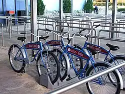 The ride vehicles, co-developed by Oceaneering International, are mounted to a track-roaming platform that provides the forward motion to move the vehicle through each show scene.[20][23] The yaw motor and attached stewart platform allow them to move 360 degrees at different angles along the track.[24] The track switches were manufactured by Dynamic Structures.[25] Each of the vehicles designed by Thierry Coup are themed as the Daily Bugle's new "Scoop" vehicle for reporters, with each accommodating 12 riders.[26] Each row of four riders is restrained by a single lap bar.[5] The system was invented by Universal Creative employees Philip Hettema, William Mason, and Gary Goddard.[27] A similar system has been patented by Oceaneering International and used on rides such as The Curse of DarKastle at Busch Gardens Williamsburg, Tokyo Panic Cruise at Tokyo Dome, and Speed of Magic at Ferrari World Abu Dhabi.[28][29][30]