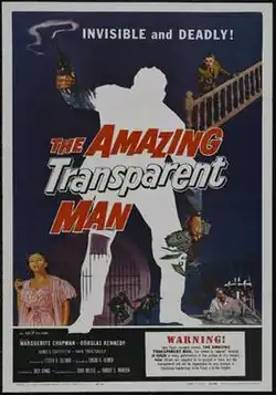 The Amazing Transparent Man is a 1960 American science fiction thriller B-movie directed by Edgar G. Ulmer and starring Marguerite Chapman (in her final feature film) and Douglas Kennedy.[2] The plot follows an insane ex–U.S. Army major who uses an escaped criminal to steal materials to improve the invisibility machine his scientist prisoner made.[3] It was one of two sci-fi films shot back-to-back in Dallas, Texas by Ulmer (the other was Beyond the Time Barrier, also released that same year).[4] The production had an approximate budget of $100,000 dollars or a little over $1,000,000 today (2025). The combined filming schedule for both films was only two weeks. The film was later featured in an episode of Mystery Science Theater 3000.