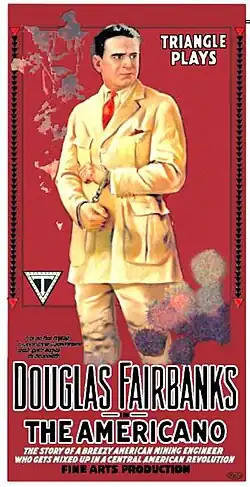 The Americano is a 1916 American silent adventure / romantic comedy film directed by John Emerson and stars Douglas Fairbanks in his last production for Triangle Film Corporation. Based on the novel Blaze Derringer, by Eugene P. Lyle, Jr., the scenario was written by John Emerson and Anita Loos who also wrote the film's intertitles.[1] The film was re-released by S.A. Lynch Enterprises on August 21, 1923.[2] Three 16mm prints and one 8mm print of the film still exists.[3] Set in a fictional South American country of Paragonia, it has been described as one of a group of films that supported United States imperialism by providing support to the idea of manifest destiny.[4]