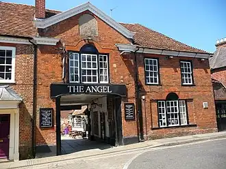 The Angel Inn is a public house in Andover, Hampshire. Constructed in the mid-15th century, it is one of England's oldest surviving inns, and the oldest and most complete example in Hampshire.[2][3] It is a Grade II* listed building, of "more than special interest nationally."[3] Despite alterations in the 16th, 17th, 18th and 19th centuries, the medieval timber frame, features and decorative details remain "remarkably intact."[3] Archaeological and documentary evidence suggest that it was built on the site of a previous inn—the College Inn—which was destroyed in the Great Fire of Andover in 1434.[4][5][6]