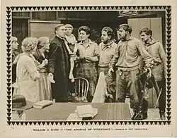 The Apostle of Vengeance is a 1916 American silent drama film directed by Clifford Smith and starring William S. Hart, Nona Thomas and John Gilbert.[1] A Kentucky-born preacher returns home from Vermont in order to settle a feud between two warring families.