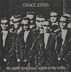 "The Apple Stretching" was written by Melvin Van Peebles for his 1982 play Waltz of the Stork.[2] The song describes New York City in the early morning. It was included on Jones' sixth album Living My Life and also released as a double A-side single with "Nipple to the Bottle", written by Jones and Sly Dunbar (which also got a separate single release in certain territories). The original 7-minute song's single edit was just the album version, faded out at 3:33. "The Apple Stretching" was simultaneously released as a 12" version, clocking in at 8:40. It included a second verse of the song, which had been omitted on the album version, where Jones sings together with a bass guitar only along with funky percussion. This version remains unreleased on CD.