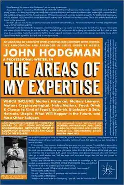 - An Almanac of Complete World Knowledge Compiled with Instructive Annotation and Arranged in Useful Order by myself, John Hodgman, a Professional Writer, in The Areas of My Expertise, which Include: Matters Historical, Matters Literary, Matters Cryptozoological, Hobo Matters, Food, Drink & Cheese (a Kind of Food), Squirrels & Lobsters & Eels, Haircuts, Utopia, What Will Happen in the Future, and Most Other Subjects