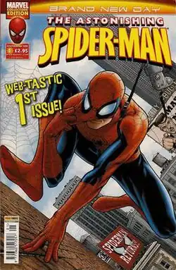 With Panini Comics having obtained the licence to reprint Marvel comics internationally, Astonishing Spider-Man began publication in November 1995.[4] 150 issues were published in the first volume before the title was re-launched in 2007 to mark its change from a four-weekly publishing schedule to a two-weekly one.[5] Volume 2 ran for two years before it was re-launched again in December 2009 to mark the start of the "Brand New Day" storyline. Volume 4 launched in October 2013 as the Superior Spider-Man run of stories began in the title. Volume 7 is ongoing.