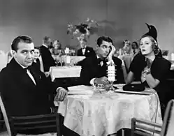McCarey believed that improvisation was the key to great comedy.[26] "[A] lot of times we'd go into a scene [on The Awful Truth] with nothing at all", he said.[81] His working method was to ask his cast to improvise the scene,[26] creating their own dialogue and blocking their own action before allowing cameras to roll. If a problem arose with a scene, McCarey would sit at a piano on the set and pick out tunes and sing until a solution came to him.[81] McCarey supported his actors' comedy and other choices, which quickly alleviated the tension which had built up on the set.[76] For example, Ralph Bellamy was told to bring a selection of clothing from his own extensive, personal wardrobe.[82] He did so, but was worried that he had not been given costuming. McCarey told him that the clothes he'd brought from home fit the part perfectly, which made Bellamy feel comfortable in his acting and comedy choices.[76] McCarey was also extremely patient with his cast, understanding of their concerns, and sympathetic to their needs and problems. He also used his own wit to keep his cast in good humor.[74] Irene Dunne later recalled that the entire cast loved working on the picture because every day was full of laughter. Many actors didn't want each day's work to end, because they were having such a good time.[74]
