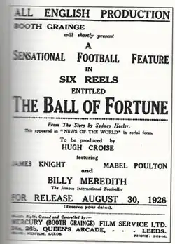 The Ball of Fortune is a 1926 British silent sports film directed by Hugh Croise and starring Billy Meredith, James Knight and Mabel Poulton.[1] Based on the 1925 novel of the same title by Sydney Horler, the film is set against the backdrop of professional football. Top player Billy Meredith appears as himself. It was produced by a Leeds-based independent film company and involved footage shot at the city's Elland Road Stadium. It is now considered a lost film.[2]