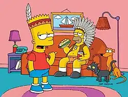 Marge subsequently establishes a peer group based on Native American life, called the "Pre-Teen Braves" — composed of Bart, Ralph Wiggum, Nelson Muntz, and Database, with herself as tribe leader after Homer fails in his leadership skills.[1]: 167–168 Later, when Marge takes the boys on a nature walk, they meet Joe Proudfoot of the Mohican tribe who shows them a field that is in need of cleaning up. The Pre-Teen Braves agree to the job, but discover that it has already been cleaned by another peer group, the "Cavalry Kids" — led by Milhouse's father, Kirk Van Houten, composed of Milhouse, Martin Prince, Jimbo Jones, and a nerd named Cosine.[1]: 169 The two groups try to outdo each other in doing good;[1]: 169–170 for example, when the Cavalry Kids bulldoze the house of the homeless from the Pre-Teen Braves and post a pre-fabricated in place, the Pre-Teen Braves retaliate by setting it on fire with arrows. When the Cavalry Kids sell candy in the hope of becoming batboys at a Springfield Isotopes game, the Pre-Teen Braves try to thwart them by lacing their candy with laxatives. Unfortunately for them, the senior citizens, in need of relief from constipation, buy the Cavalry Kids a win.