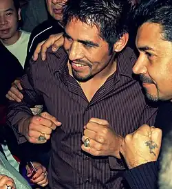 On July 21, 2001, Margarito's bout with WBO welterweight champion Daniel Santos ended in a no contest after the fighters' heads collided in the first round and a deep cut was opened over the corner of Margarito's right eyebrow.[19] He would get another opportunity to win the WBO title on March 16, 2002 against Antonio Diaz. Margarito defeated Diaz by tenth round technical knockout to win the title, which had been vacated by Santos.[20] Seven months later, he made his first successful defense of the WBO title with a unanimous decision victory over Danny Perez.[21] His second title defense came against former WBA welterweight champion Andrew Lewis at the Mandalay Bay Resort and Casino in Las Vegas on February 8, 2003. Margarito won the fight by second round technical knockout after a significant amount of punches from Margarito led to a stoppage from the referee.[22] On January 31, 2004, at the Dodge Theatre in Phoenix, Arizona, Margarito defeated Hercules Kyvelos by second round technical knockout in his third title defense. After the fight, he discussed his interest in a major fight with Oscar De La Hoya, Shane Mosley, or Fernando Vargas.[23]
