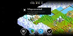 Each player begins with a small settlement and a unit that they can use to explore the world map.[3] On their turn, players can move all of their units and spend a resource called stars.[5] Cities generate stars,[2] which can be spent to unlock new abilities on the technology tree, create more units to wage war, or collect materials to upgrade cities and allow them to support more soldiers.[3][5] Upgrading cities allows the player to choose between one of two benefits, such as allowing the settlement to generate extra stars every turn, or send out a messenger that explores the map.[5][6] Players gain new cities by conquering villages at set points around the world.[3]