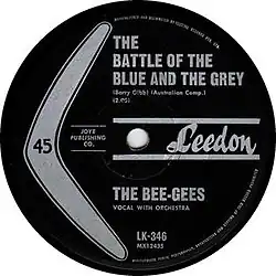 "The Battle of the Blue and the Grey" is a debut single by the Bee Gees, backed by "The Three Kisses of Love" and released on March 22, 1963.[2] Like all the Bee Gees' output prior to 1967 (with the notable exception of Spicks and Specks) it was only released in Australia. It was performed in Australian television Bandstand, the footage of that performance still exists. It reached #93 in Australia.