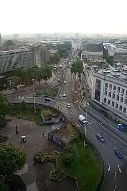 The St James Barton roundabout, colloquially known as the Bearpit, is a grade-separated roundabout and sunken pedestrian area in the city centre of Bristol, England.[1] Completed in 1968 as part of Bristol’s post-war road development scheme,[2] it carries the north-south A38 and the east-west A4044 while pedestrians and cyclists circulate one storey below in a circular concourse whose form inspired the nickname.