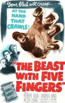 The Beast with Five Fingers is a 1946 American mystery horror film directed by Robert Florey from a screenplay by Curt Siodmak, based on the 1919 short story of the same name by W. F. Harvey. The film stars Robert Alda, Victor Francen, Andrea King, and Peter Lorre. The film's score was composed by Max Steiner.
