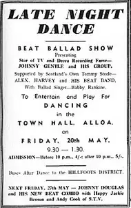 - ^ "Live: Town Hall, Alloa, Scotland". The Beatles Bible. 20 May 1960. Retrieved 13 November 2021.