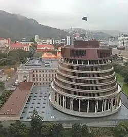 The Beehive (Māori: Te Whare Mīere)[2][3] is the common name for the Executive Wing of New Zealand Parliament Buildings, located at the corner of Molesworth Street and Lambton Quay, Wellington. It is so-called because its shape is reminiscent of that of a traditional woven form of beehive known as a skep. It is registered as a Category I heritage building by Heritage New Zealand.
