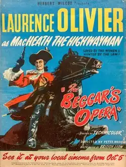 The Beggar's Opera is a 1953 British historical musical film, a Technicolor adaptation of John Gay's 1728 ballad opera of the same name. The film, directed by Peter Brook in his feature film debut, stars Laurence Olivier (in his sole musical), Hugh Griffith, Dorothy Tutin, Stanley Holloway, Daphne Anderson and Athene Seyler. Olivier and Holloway provide their own singing, but Tutin and others were dubbed.