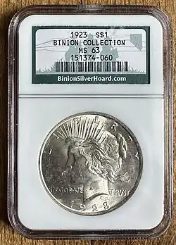 The silver from the hoard was evidence in the criminal proceedings. While the trial was proceeding through the courts, Judge Joseph Bonaventure did not allow the estate of Ted Binion to sell the silver. The estate had to wait to sell the hoard until after the penalty hearing in the convictions which took place May 23, 2000.[17] In July of 2000, the Binion estate was moving to sell the silver and other assets. The 38-acre (15 ha) vacant lot where Ted Binion kept the hoard was sold to two casino executives for US$6.5 million. The estate also began accepting sealed bids for the silver hoard.[10] The proceeds of asset sales were to be placed in a trust for Ted Binion's nineteen year old daughter.[10] In October of 2001, Ted Binion's estate sold the silver coins to Spectrum Numismatics International for US$3.3 million (equivalent to $6,400,000 in 2024). Approximately 50,000 silver coins were uncirculated, and some of the coins remained in the original mint bags.[26] In 2002, the coins were marketed by the company for between US$50 and US$10,000. The coins were certified in coin slabs by the Numismatic Guaranty Company (NGC).[27] According to NGC, there were 100,000 high quality US silver dollars in the collection. Coin retailer Goldline International was selected to market the coins.[28]