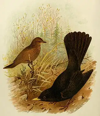 One of the earliest tellings of the Greek story in another European language was as Fable 31 in Giovanni Maria Verdizotti's "100 Moral Fables" (Cento favole morali, 1570).[4] There the story is told of a lark (lodola), while a blackbird (merle) is the bird named in the nearly contemporary 1582 French edition of Aesop's fables,[5] remaining so through the following centuries. In English tellings also it is always a blackbird that is named.