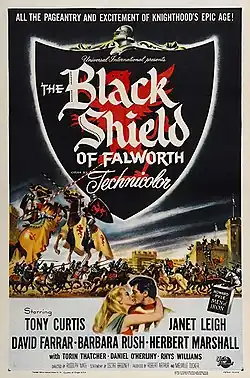 The Black Shield of Falworth is a 1954 American Technicolor historical adventure film from Universal-International, produced by Robert Arthur and Melville Tucker and directed by Rudolph Maté. It stars Tony Curtis, Janet Leigh, David Farrar, Herbert Marshall, and Torin Thatcher. The screenplay, set in Medieval England, was adapted by Oscar Brodney and is based on Howard Pyle's 1891 novel Men of Iron. The original music score was composed by Hans J. Salter although his name does not appear in the screen credits. The only musical notation is given as: "Music Supervision by Joseph Gershenson". Made Universal's music department head in 1940, Gershenson's name appeared on nearly every film made by that studio from 1949–1969.[2]