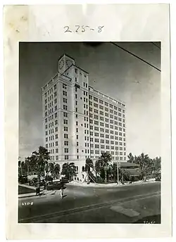 It was designed as the Blackstone Hotel by architect B. Kingston Hall in 1929. Built and designed in the Mediterranean Revival style, the hotel was 13 stories high, had a mission tile roof supported by exposed rafters, and was topped by a clock that concealed the hotel’s elevator machinery.[2] Nathan Stone, a Jewish entrepreneur, was the developer but he died shortly before the hotel opened in 1929. Nathan's son Alfred Stone (father of future senator U.S. Senator Richard Stone) completed the construction and ran the hotel. At the time it was built, it was considered to be the tallest building in the city, and so remained for seven years.[3]