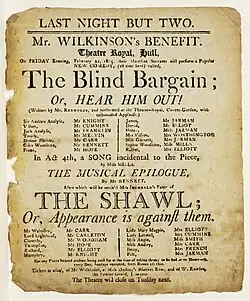 The Blind Bargain is an 1804 comedy play by the British writer Frederick Reynolds.[1] It premiered at the Theatre Royal, Covent Garden in London on 24 October 1804. The original cast included John Fawcett as Sir Andrew Analyse, Charles Farley as Jack Analyse, William Thomas Lewis as Tourly, Charles Kemble as Villars, William Blanchard as Doctor Pliable, John Emery as Giles Woodbine, Maria Gibbs as Mrs Villars and Mary Ann Davenport as Miss Gurnet. Its Irish premiere was at the Crow Street Theatre in Dublin on 1 December 1804.[2]