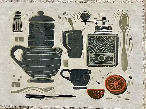 The Blockhouse of Boston was a pioneering art and design cooperative of alumni from the Massachusetts College of Art in Boston, Massachusetts that opened its doors in 1947.[1] Blockhouse artisans, primarily the then-recent art school graduate Janet Doub Erickson, designed and produced original textiles including draperies, wall hangings, table linens, costume treatments and other art. The co-op specialized in linoleum blockprints — also known as linocuts — and screen printing. Blockhouse was known for original use of New England themes and motifs intermingled with bold ethnic designs [2] at times inspired by pre-Columbian art and sometimes with modernist motifs.[3] As a journalist described some of Blockhouse principal designer Janet Doub Erickson's inspirations in a 1952 profile, "she goes to New Guinea for her motif, 'Checkerboard,' to China for her "Quan-Yin" design, to Guatemala for "Mayan Stele," and to a Northwest Indian reservation for "Totemotif."[4]