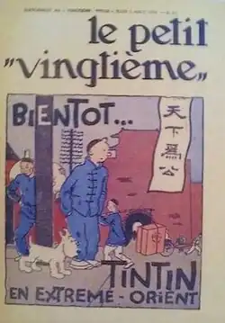 The comic strip began serialisation in Le Petit Vingtième on 9 August 1934 as Les Aventures De Tintin Reporter En Extrême-Orient (The Adventures of Tintin, Reporter in the Far East).[23] It began serialisation in France in Cœurs Vaillants from 29 December 1935,[24] and later in the Swiss magazine L'Écho Illustré.[25] Alongside protagonists Tintin and Snowy, Hergé also included the detectives Thomson and Thompson in the story, who had been introduced in the previous story.[26] He also alluded to the movie that Tintin and Snowy had interrupted the filming of in Cigars, Rastapopoulos' The Sheik's House, by having the characters watch the film during a cinema screening.[27]