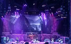 Tying in with the album's title and theme, the stage set was decorated in a manner which mimics Maya architecture.[55] The band's mascot, Eddie, in his Mayan guise from The Book of Souls album cover, appeared at two points during the show: as a walking puppet during "The Book of Souls" and as an inflatable head during "Iron Maiden".[55][56] In addition, an inflatable goat/devil appeared during "The Number of the Beast".[56]
