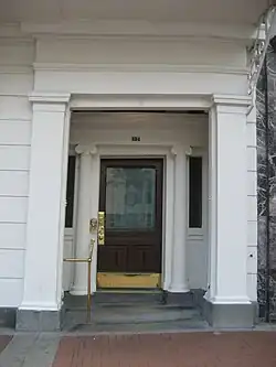 Entering from Canal Street, the entrance to the club is a 10x12 vestibule framed by sidelights between engaged ionic pilasters and columns, with a wooden door inscribed in a frosted glass the club's initials BC, opening into a marble-paved hallway. Adjacent, to the left through a solid mahogany door,[3] is a well-decorated parlor, extending fifty-five feet deep from the front facade. Here can be found leather chairs, lace curtains, and rockers with foremost men of New Orleans discussing current events. There is a reception area with a large round table behind leading into formal and informal dining areas. The formal dining room is forty-five feet deep, with molded stucco ceiling cornices and large center ceiling medallion of floral designs, and mantels finished in the period Eastlake Style replacing earlier marble mantel carved with cherubs and flute players. The bar, located behind the informal dining area, is made of oak along with the wainscot running around the room. The second floor has two rooms, the front, a former card room while the rear is mainly used as a sitting room but can be converted easily into a dining room, it is finished in oak with cypress doors and is attached to a billiards room, board room and lady's water closet.[57]