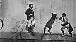 The Boxing Kangaroo is an 1896 British short black-and-white silent documentary film, produced and directed by Birt Acres for exhibition on Robert W. Paul's peep show Kinetoscopes, featuring a young boy boxing with a kangaroo. The film was considered lost until footage from an 1896 Fairground Programme, originally shown in a portable booth at Hull Fair by Midlands photographer George Williams, donated to the National Fairground Archive was identified as being from this film.[1]