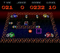 A time limit is in effect; running out of time means losing a life.[1] Players can only control the direction in which a Brainy will walk; taking care not to bump into another Brainy or an obstacle.[1] There are four difficulty levels and the object is to return the Mexican jumping beans safely home. Items can be picked up; they may be beneficial or detrimental to the Brainy depending on certain factors.[1] Arrows can also force a Brainy to change directions, rendering him helpless for a while and possibly messing up a carefully solved puzzle.[1]