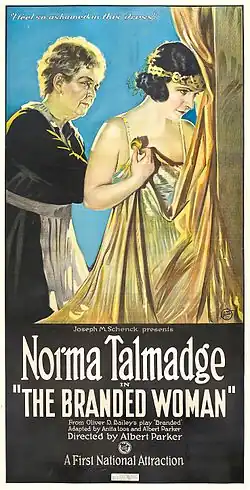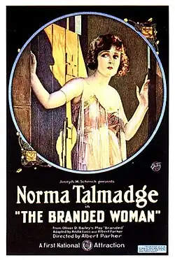 The Branded Woman is a 1920 American silent drama film released by First National Pictures. It stars Norma Talmadge who also produced the film along with her husband Joseph M. Schenck through their production company, Norma Talmadge Productions. The film is based on a 1917 Broadway play Branded, by Oliver D. Bailey and was adapted for the screen by Anita Loos and Albert Parker who also directed.[1][2]