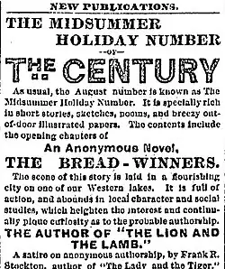 In March 1883, the Century Company circulated a postcard, with copies likely sent to newspapers and potential subscribers. Under the heading "Literary Note from The Century Co.", and giving some information about the plot, it announced that an anonymous novel, "unusual in scene and subject, and powerful in treatment" would soon be serialized in the pages of the Century.[36] The serial was originally supposed to begin in April or May, but was postponed because Frances Hodgson Burnett's novel Through One Administration ran long.[37] On July 20, the date of release of the August number, the company placed newspaper advertisements for The Bread-Winners, and said "the story ... abounds in local description and social studies, which heighten the interest and continually pique curiosity as to its authorship."[36] The Bread-Winners appeared in the Century from August 1883 to January 1884, when it was issued as a book by Harper and Brothers.[38]