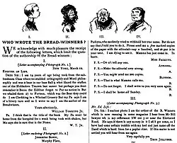 Tiring of the guessing game, some newspapers descended to satire. The New Orleans Daily Picayune surveyed the lengthy list of candidates and announced that "the authors of The Bread Winners [sic] will all meet at Chautauqua next summer."[44] Another columnist suggested that a statistic be put in the next census for the number of people named as the author.[45] The appearance of President Arthur's annual message to Congress in December 1883 caused the Rochester Herald to opine that he had written The Bread-Winners "because a careful comparison of his message with the story shows many words common to both".[46] Another Upstate New York paper, the Troy Times, evoked Parson Weems's tales of George Washington: "We cannot tell a lie. We wrote The Bread winners [sic] with our own little hatchet. If any one doubts it, we can show him the hatchet."[46] This admission, the Buffalo Express felt, should put an end to the discussion.[46]