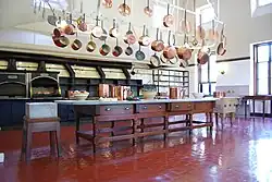 Kitchen – The kitchen, unlike others in the time period, was situated on the first floor away from the main house to prevent the possibility of fires and cooking smells reaching the main parts of the house. The well-ventilated room supports a 21 ft (6.4 m) cast iron stove, which heats up as a single element through a coal burning stove. The work table is made of zinc, a metal which served as the forerunner to stainless steel; in front of it is a marble mortar used to crush various ingredients. Ice cut in winter from the local ponds kept the side rooms cool where food was stored, and facilitated a colder room for the assembling of confections.[13] The kitchen and baking pantry each have one dumbwaiter that travels to the basement level where groceries were delivered and refuse removed.