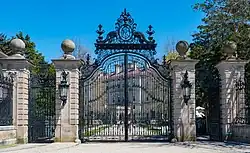 The Ochre Point Avenue entrance is marked by baroque forged wrought iron gates, and the 30-foot-high (9.1 m) walkway gates are part of a 12-foot-high (3.7 m) limestone-and-iron fence that borders the property on all but the ocean side. The footprint of the house covers approximately one acre (0.4 hectares) or 43,000 square feet of the 14-acre (5.7-hectare) estate on the cliffs overlooking Easton Bay of the Atlantic Ocean.[3]