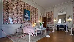 Guest bedroom – This room exemplifies the Louis XVI style through furniture, woodwork and light fixtures, with Neoclassical style abounding in the interior. The wall paneling has never been retouched, though the rest of the room has been restored by the preservation society.