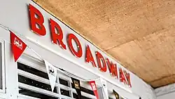 The Broadway was constructed with a recessed three-storey tower as the central section flanked by two-storey wings curving in to meet it. The front entrance featured four sets of double doors with Art Deco glazing, set back from the street by a golden terrazzo floor. The entrance was flanked by four shop units, two on each side, which also featured upon construction matching Art Deco glazing to the cinema itself. The vertical central tower was built largely of reconstituted sandstone with two sets of three narrow window bays on both the first and second floors of the building, and at the top of the tower was a large wooden Broadway sign coloured in red and gold.
