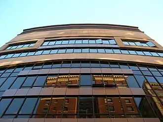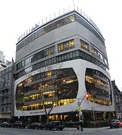 Once called the television building because of its former façade, Calhoun's original building at 81st Street was completed in 1975 and designed by Costas Machlouzarides. In 2000, The Calhoun School hired New York-based architecture firm FXFOWLE to design a four-story addition, which was completed for the 2004 school year.[8] DesignShare, a journal of educational facilities planning, called the four-floor addition a "courageous design," with special mention of the School's Green Roof as "an innovation in the architecture for learning." The Green Roof and FXFOWLE were named DesignShare's recipients of a 2007 Merit Award—one of only seven recipients worldwide to receive the award. In fact, the Green Roof has attracted international attention and acclaim, with architects and educators coming from as far away as Japan, Brazil, Italy, Ireland, and Great Britain to see how the school has taken a leadership position in green architecture and sustainability. Ten years later, in the summer of 2014, the school began another 3-month renovation project of the 81st Street building with FXFOWLE, to expand the interior of the first floor by enclosing an outdoor plaza.[9] The result had a significant—and positive—impact on the face of the iconic building while maintaining the "overhang" effect that—when first built in the 1970s—people claimed looked like a Brownie camera flash cube or a television set.