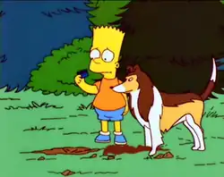 Realizing Santa's Little Helper is gone, the family bonds with Laddie, except for Bart, who fears for Santa's Little Helper's fate. When an exhausted Bart takes Laddie on one of his frequent walks, the collie saves the life of Baby Gerald. At the ceremony honoring Laddie's heroism, Chief Wiggum decides that he would make the perfect police dog. Bart gives him to the Springfield police force and breaks down crying while explaining to his family why they no longer have any dog at all. Homer instructs him to find Santa's Little Helper. Bart eventually learns from Reverend Lovejoy that the dog was given to a parishioner, Mr. Mitchell.