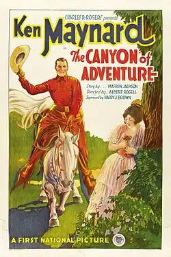 The Canyon of Adventure is a 1928 American silent Western film directed by Albert S. Rogell and written by Marion Jackson and Ford Beebe. The film stars Ken Maynard, Virginia Brown Faire, Eric Mayne, Theodore Lorch, Tyrone Brereton and Hal Salter. The film was released on April 22, 1928, by First National Pictures.[1][2][3]