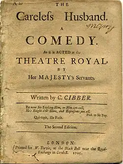 The Carless Husband is a comedy play by the English writer Colley Cibber. It premiered at the Theatre Royal, Drury Lane on 7 December 1704.[1] The original cast featured Cibber as Lord Foppington, George Powell as Lord Morelove, Robert Wilks as Sir Charles Easy, Anne Oldfield as Lady Betty Modish, Frances Maria Knight as Lady Easy, Henrietta Moore as Lady Graveairs and Jane Lucas as Mrs Edging.[2] It has been described as Cibber's most successful play, and provided a vehicle for his popular foppish Lord Foppington personae.[3]