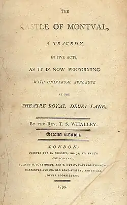 The Castle of Montval is a tragedy by the British writer Thomas Sedgwick Whalley. It was first published in 1781, but was not staged in London's West End until 23 April 1799 when it appeared at the Theatre Royal, Drury Lane where it succeeded The East Indian by Matthew Lewis. The Drury Lane cast included Sarah Siddons as Countess of Montval, John Philip Kemble as the Old Count, James Aickin as Count of Colmar, Charles Holland as Count of Montval, Charles Kemble as Marquis of Vaublane, William Barrymore as Lapont, John Hayman Packer as Blaise, Jane Powell as Matilda and Elizabeth Heard as Teresa.[1] It was part of the tend of Gothic plays popular during the era.[2] [3]