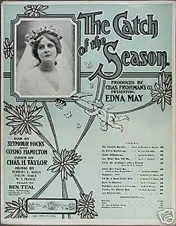 Frohman produced the musical on both sides of the Atlantic, and one year after the premiere, with the London production still running, he exported The Catch of the Season to Daly's Theatre in New York, where Edna May starred with an English supporting cast and a chorus of English and French "Gibson Girls".[2][3] The score was supplemented with numerous interpolations, principally by American music director William T. Francis and also by Jerome Kern.