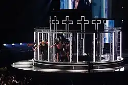 For the song "Bedtime Story" (1995), the front of the stage would rise 5 m (16 ft) and transform into a giant cube.[38] Projectors covered each side of the cube, and depicted a video created by Brazilian video game developer Gabriel Massan.[39] Inspired by the original "Bedtime Story" music video, Massan's visual depicted "dreamy" landscapes, while Madonna's movements were recorded in real time and linked to an avatar that emulated them.[39] The stage also came equipped with a vast circular lighting rig,[28] 14 spotlights, 600 intelligent lighting, and over 8,800 lighting cues.[22] Props included a massive disco ball for "Holiday" (1983), and a carousel adorned with crosses for "Like a Prayer" (1989).[40]